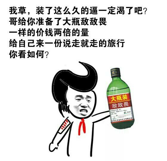 我草,装了这么久的逼一定渴了吧?哥给你准备了大瓶敌敌畏,一样的价钱两倍的量,给自己来一份说走就走的旅行,你看如何?