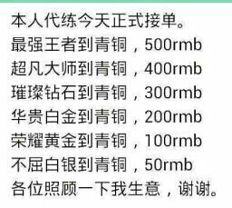 钻石到青铜300RMB,黄金到青铜200RMB,各位照顾下我生意,谢谢英雄联盟:本人代练今天正式接单,最强王者到青铜500RMB,超凡大师到青铜400RMB