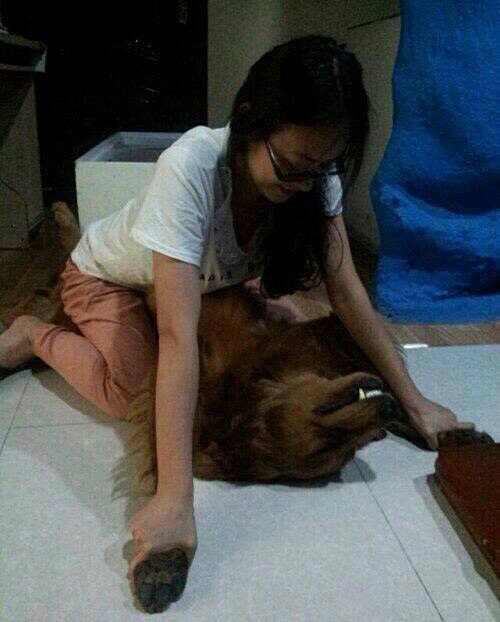 戴眼镜的漂亮妹子笑着把一条狗按住手腿按在地上 狗闭着眼镜
