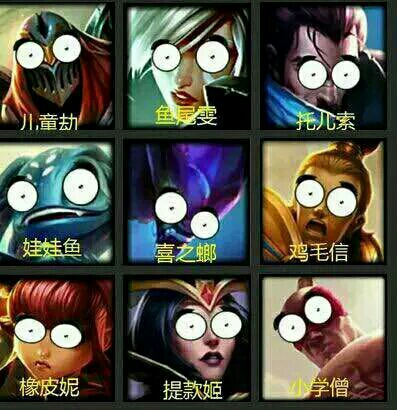 劫,锐雯,亚索,小鱼人,菊花信,安妮,妖姬,瞎子英雄联盟LOLOL大眼睛版:儿童劫,鱼尾雯,托儿索,娃娃鱼,喜之螂,鸡毛信,橡皮妮,提款姬,小学僧