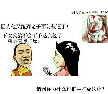 因为他又跑到老子面前装逼了!下次我就不会下手这么轻了,就是直接打屎身为群主装个逼都不行吗?请问你为什么把群主打成这样?因为他又